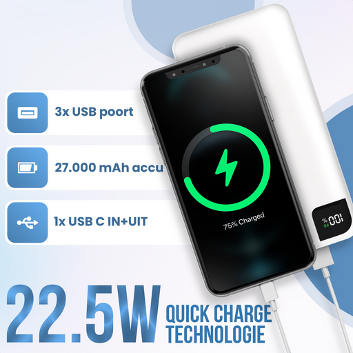 Strex Powerbank Wit - 27.000 mAh - 22.5W Snellader - USB-A/USB-C - LED Indicatie - Universele Powerbank geschikt voor o.a. iOS/Android